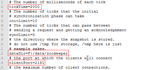 tickTime: 心跳的时间,单位毫秒. Zookeeper 服务器之间或客户端与服务器之间维持心跳的时间间隔,也就是每个 tickTime 时间就会发送一个心跳。表明存活状态。
