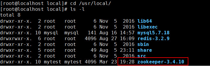 执行命令:tar -zxvf zookeeper-3.4.10.tar.gz -C /usr/local/