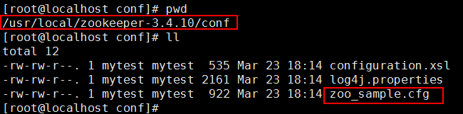 在 zookeeper 的 conf 目录下,将 zoo_sample.cfg 改名为 zoo.cfg,cp zoo_sample.cfg zoo.cfg